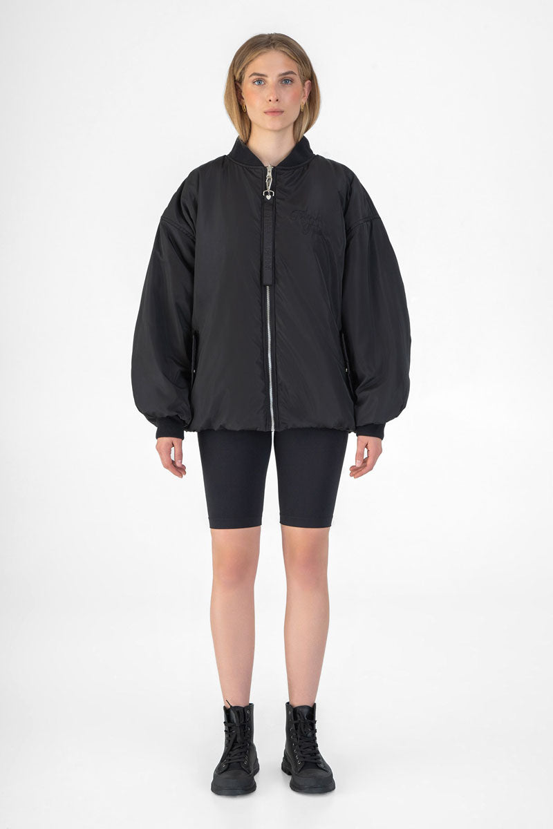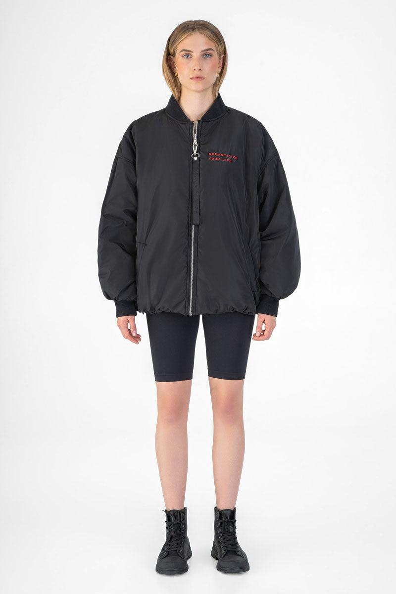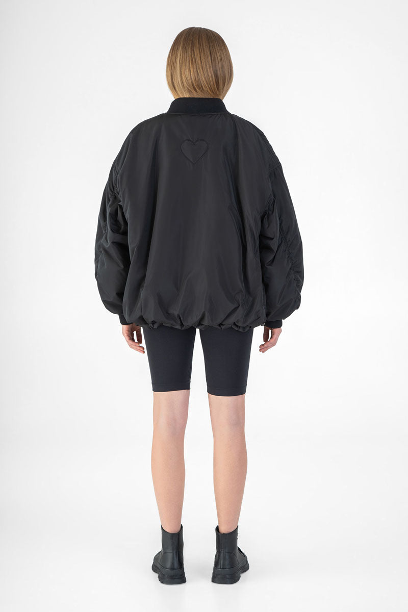 Один бік бомбера демонструє яскравий різнокольоровий вишитий принт, тоді як інший бік з однотонним оформленням містить об’ємну деталь у формі серця на спині і мінімалістичне лого спереду.