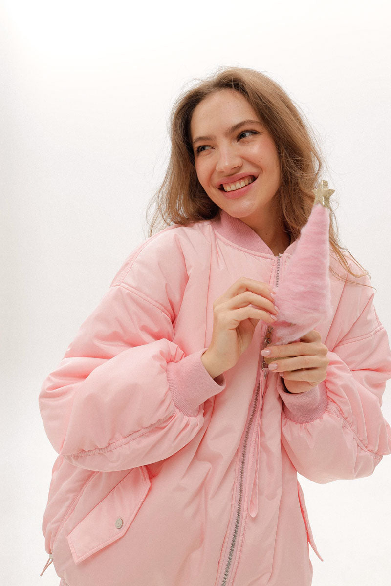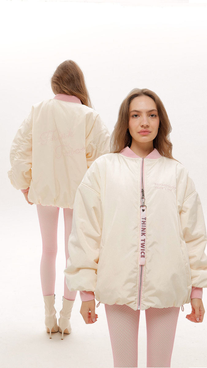 Блискавка доповнена карабіном зі стрічкою з глітерним написом «THINK TWICE», що додає блиску та неповторності даному виробу. Для максимального комфорту та захисту від вітру куртка оснащена внутрішніми фіксаторами знизу, які дозволяють регулювати посадку.