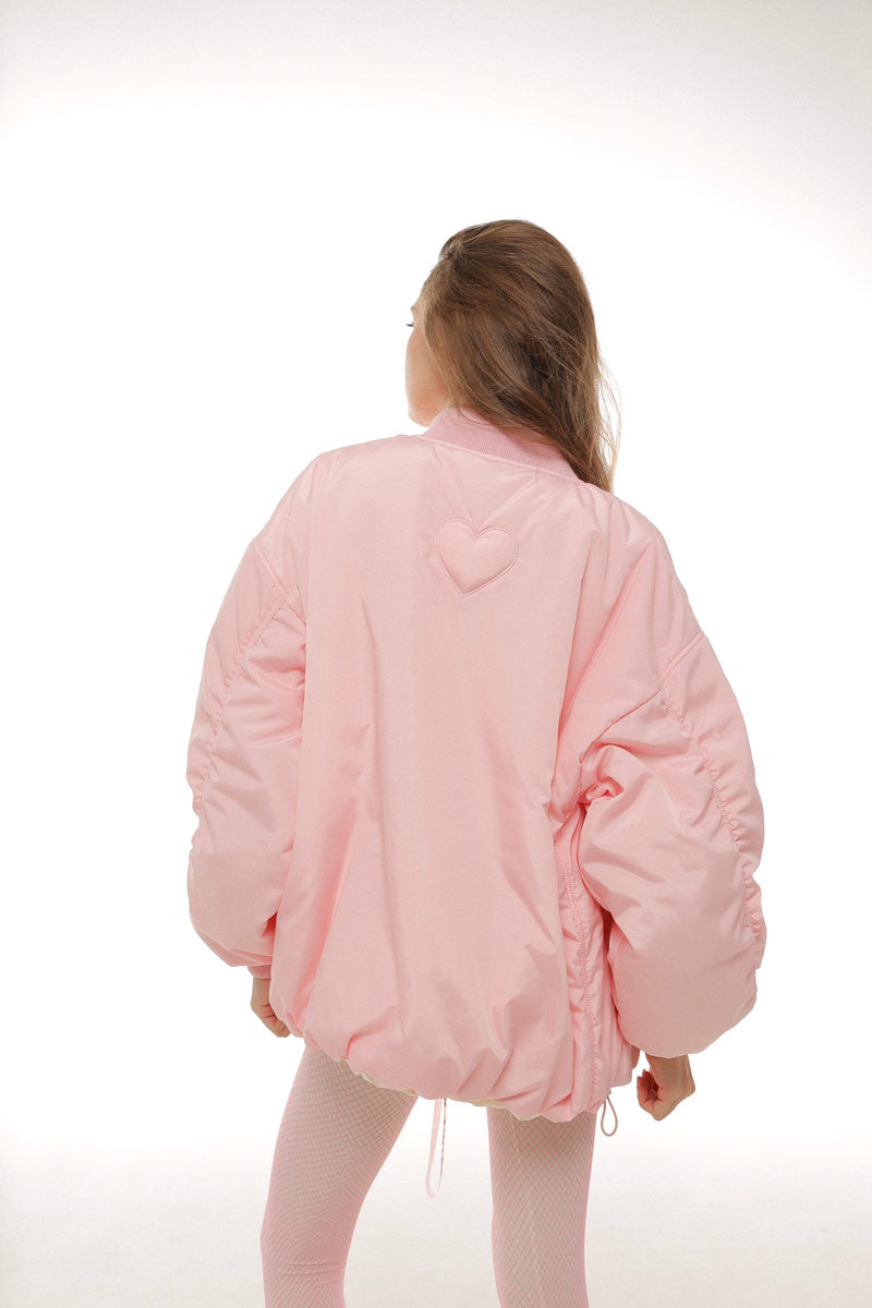 Один бік бомбера демонструє яскравий різнокольоровий вишитий принт, тоді як інший бік з однотонним оформленням містить об’ємну деталь у формі серця на спині і мінімалістичне лого спереду.