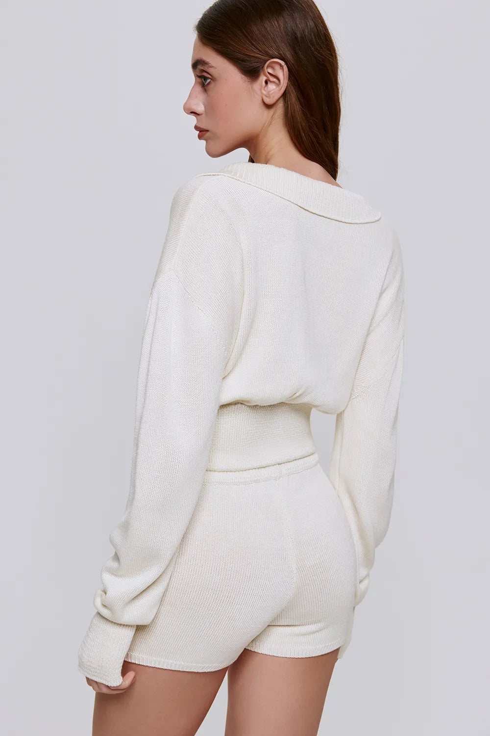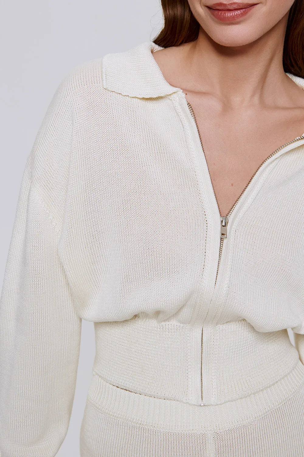Укорочений джемпер із блискавкою та коміром. Широкий трикотажний пояс на талії та широкі манжети на рукавах.