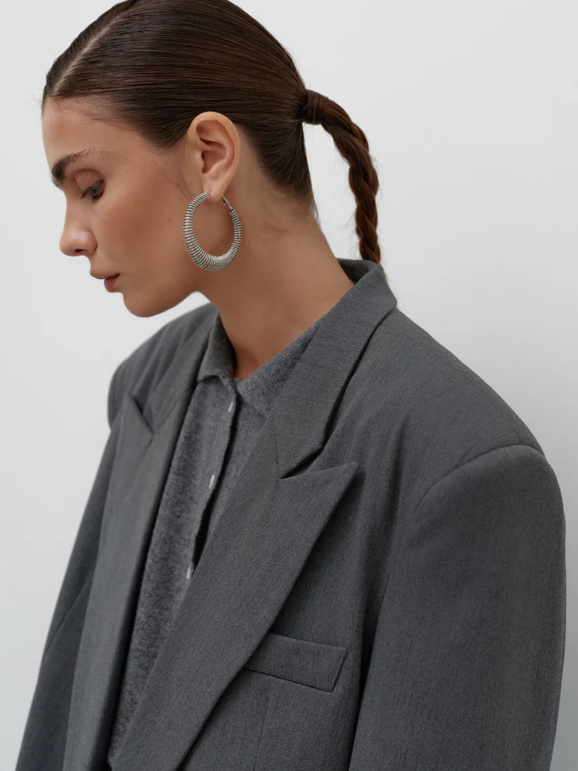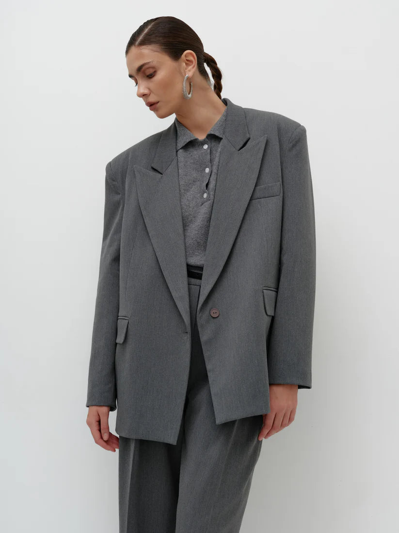 Жіночий жакет сірий - це стильне та універсальне доповнення до сірих жіночих штанів палаццо. Його вільний крій і плечики створюють сучасний силует, додаючи елегантності та витонченості образу. Лаконічний дизайн жакета робить його ідеальним як для ділових, так і для повсякденних луків.
