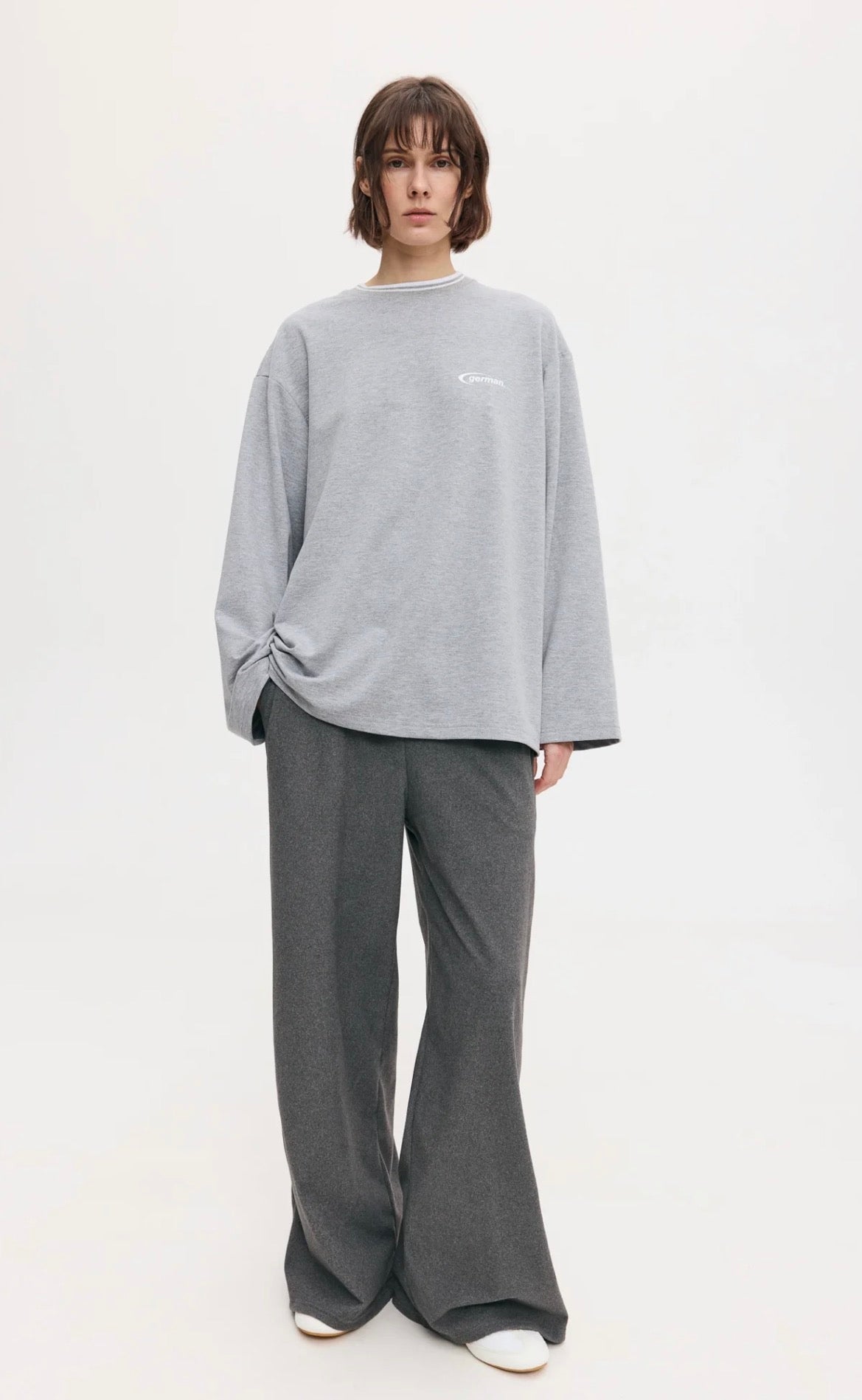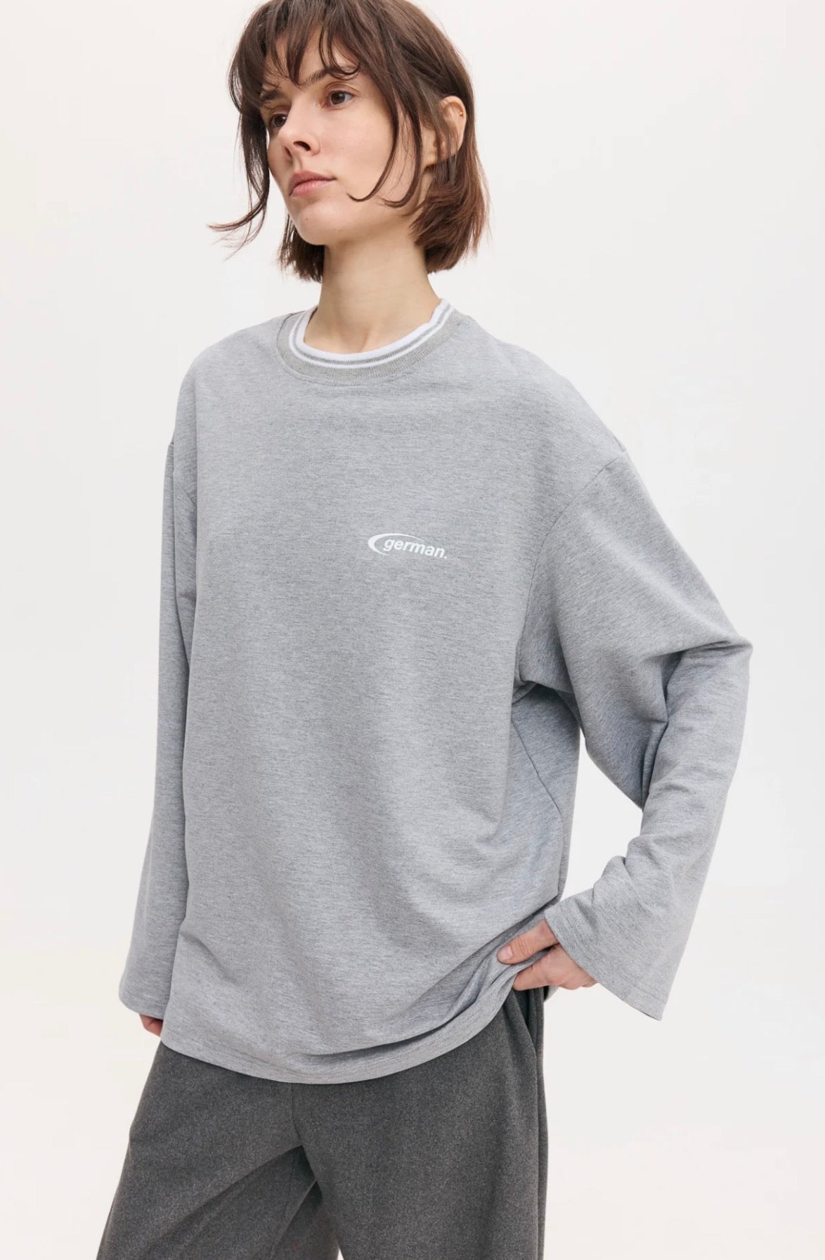 Лонгслів oversize силуету з еластичної двонитки. Комір трикотажний в смужку. Спереду надрукований стилізований логотип “german.”