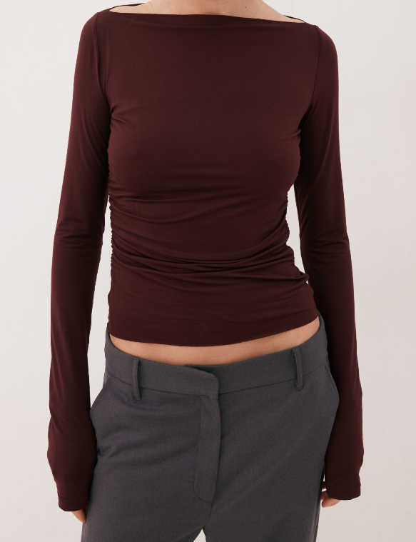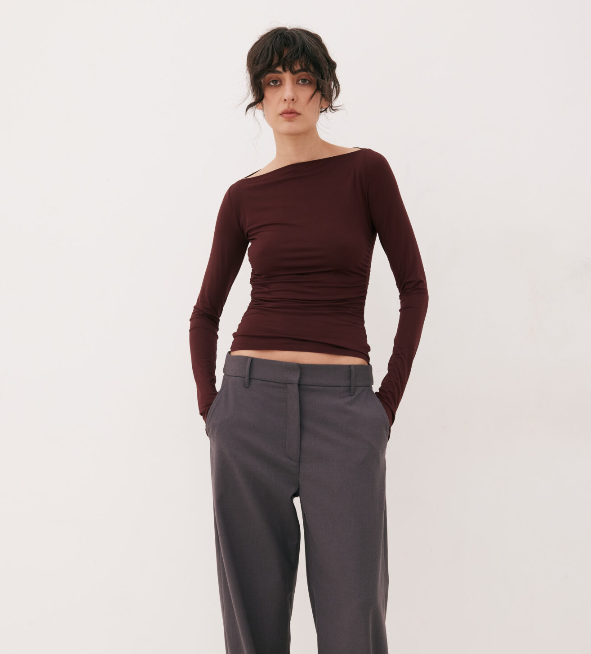 Базовий лонгслів з ніжною, приємною на дотик тканиною. Збірка з обох боків коригує силует та робить можливою посадку на потрібну довжину.