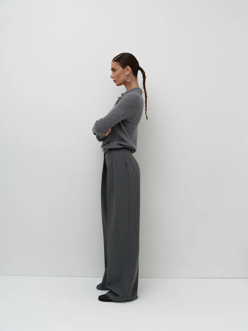 Сірі жіночі штани палаццо – це стиль, мінімалізм та легкість у стилізації. Вільний крій створює елегантний силует, а висока посадка підкреслює талію. Лаконічний дизайн робить їх універсальними: вони чудово поєднуються як із класичними піджаками, так і з легкими топами.