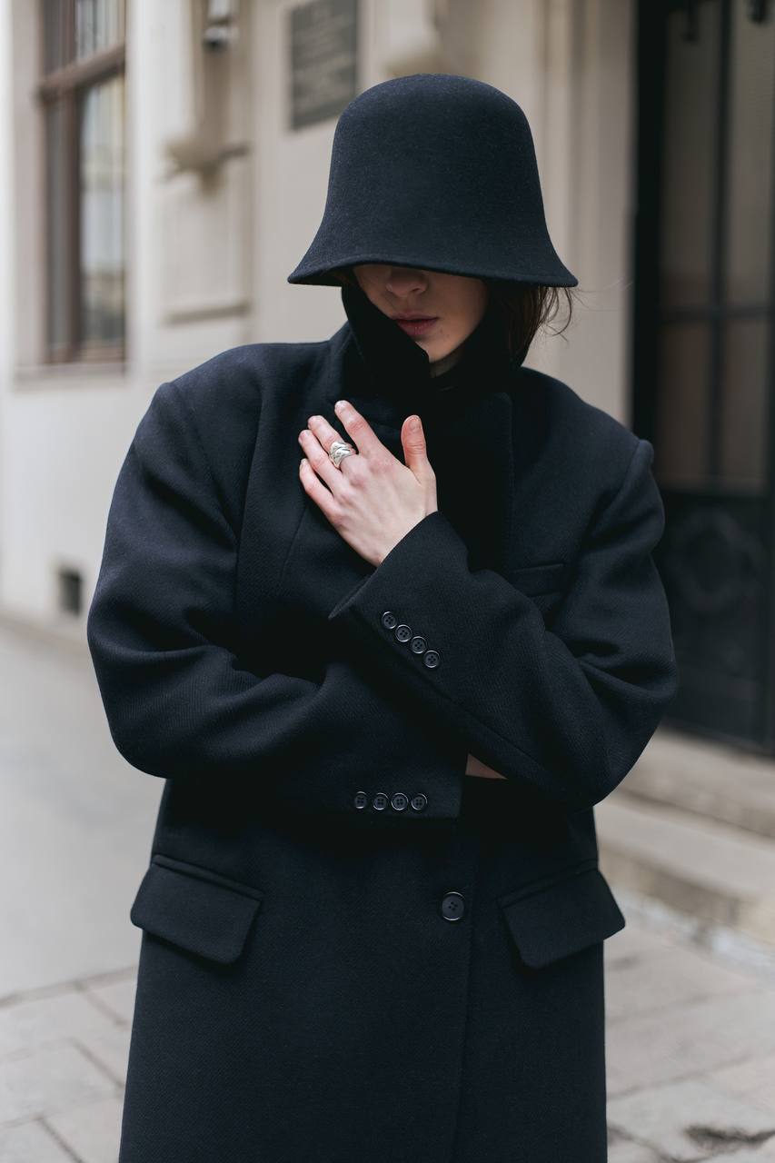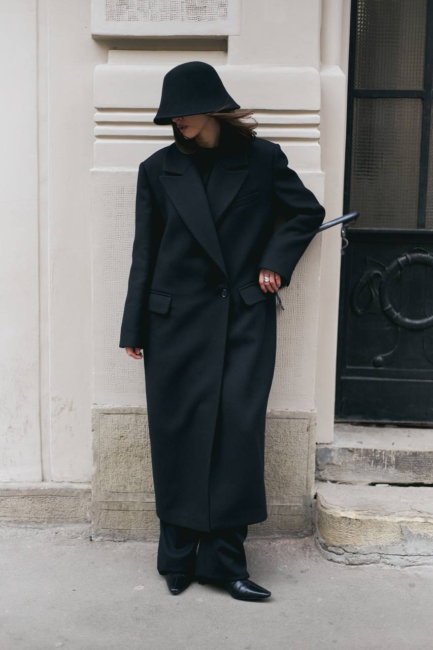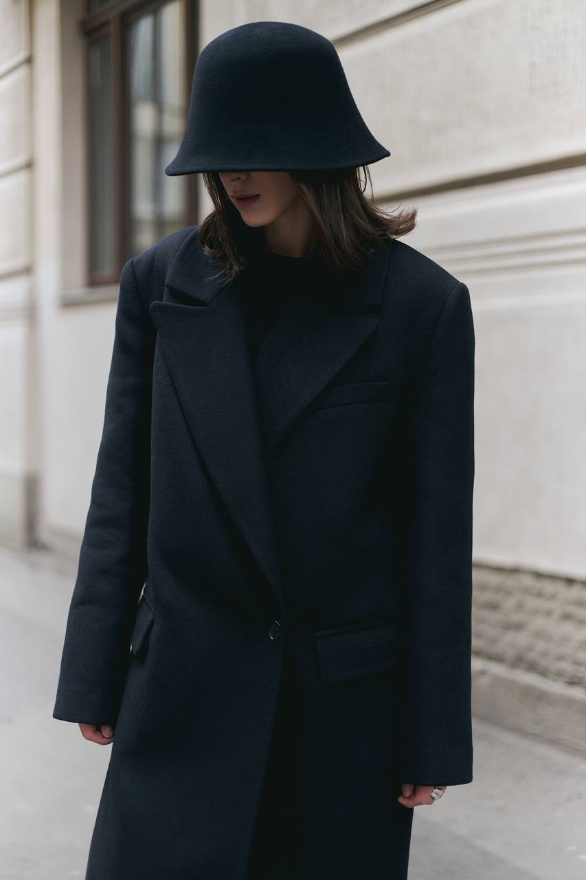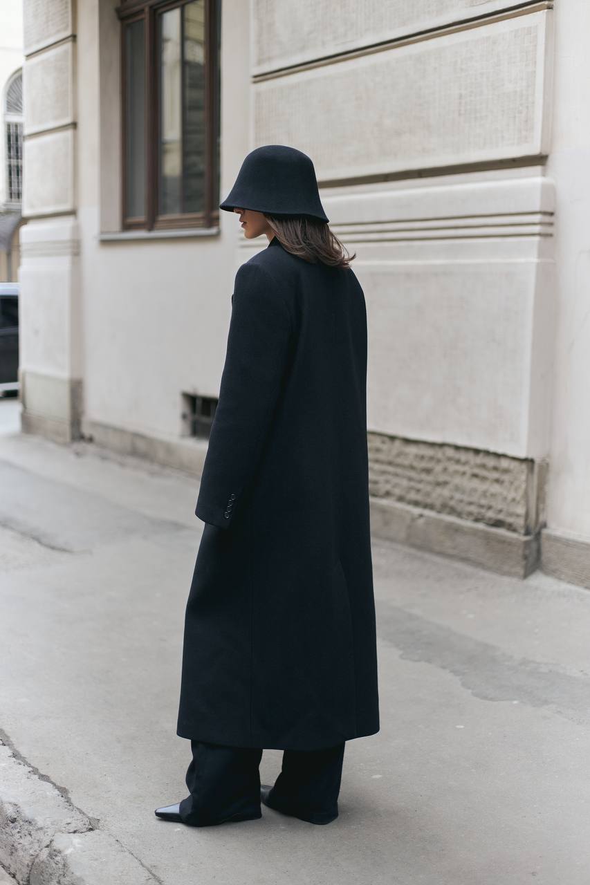Основною особливістю цього пальто є його структуровані плечі та лацкани, що створюють чіткий силует. Пальто має дві накладні кишені з клапанами та одну декоративну кишеню на грудях. Спереду пальто застібається на один прихований ґудзик та один видимий, що підтримує його мінімалістичний вигляд.