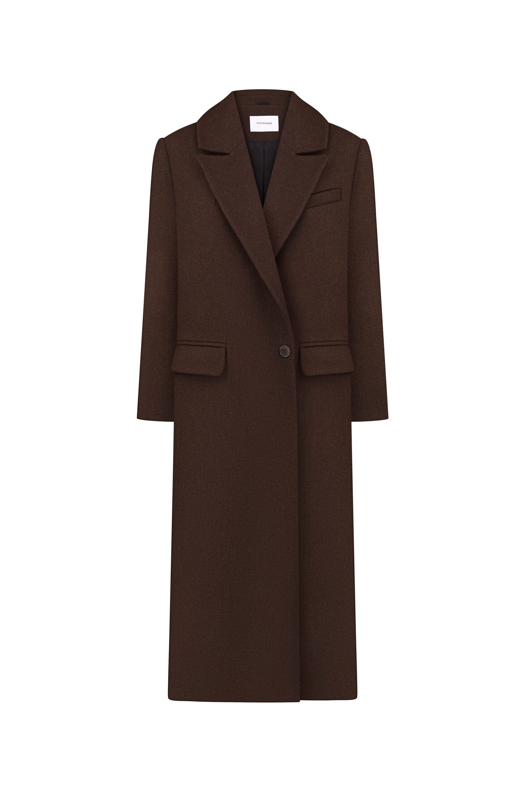 Основною особливістю цього пальто є його структуровані плечі та лацкани, що створюють чіткий силует. Пальто має дві накладні кишені з клапанами та одну декоративну кишеню на грудях. Спереду пальто застібається на один прихований ґудзик та один видимий, що підтримує його мінімалістичний вигляд.