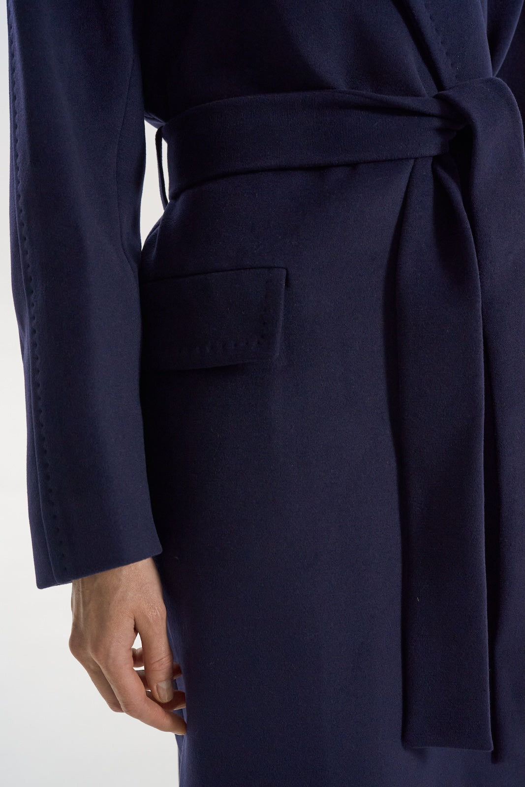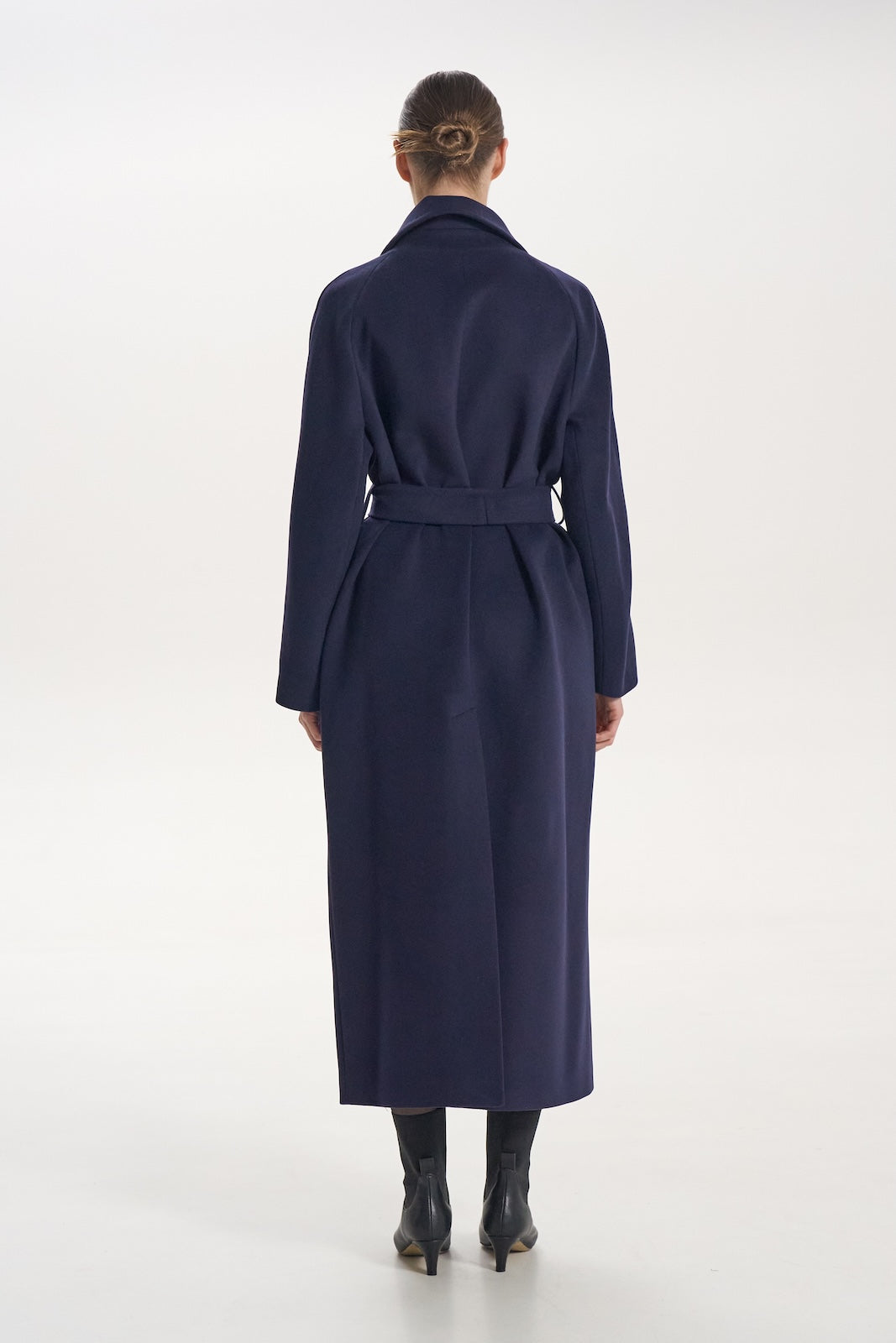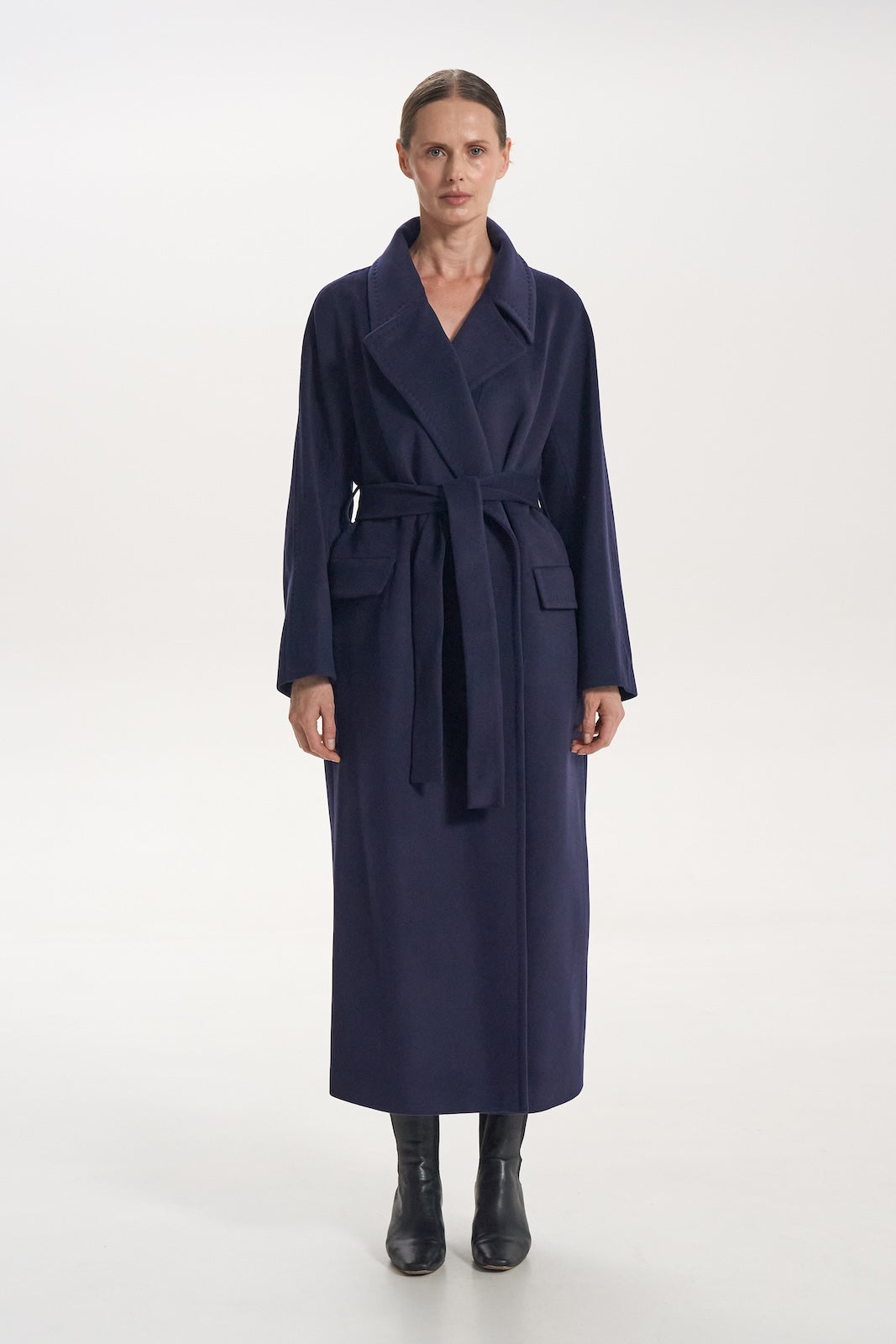 Довге пальто-халат насиченого синього кольору з поясом на талії. М’який силует із відкладним коміром і накладними кишенями поєднує комфорт і елегантність.