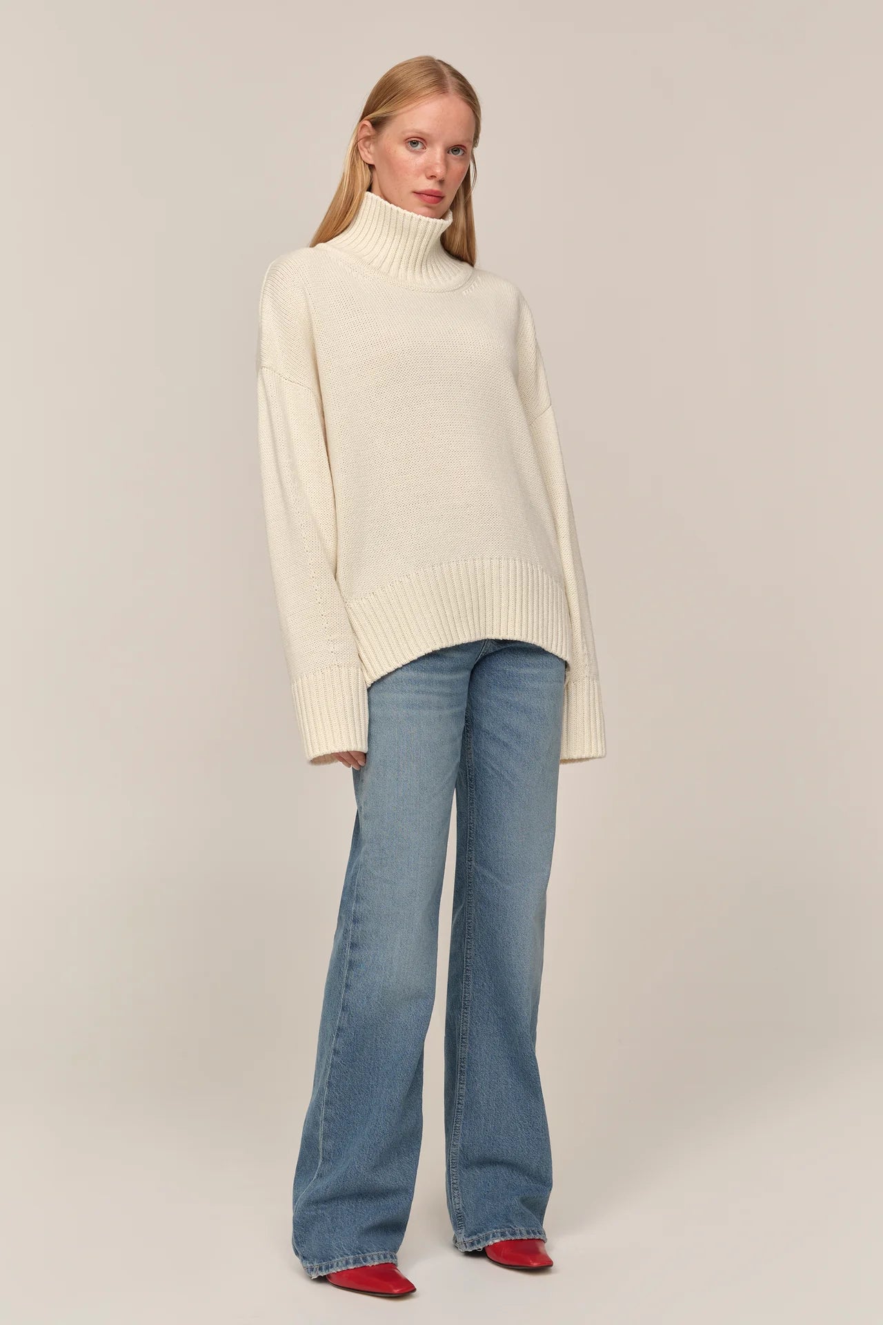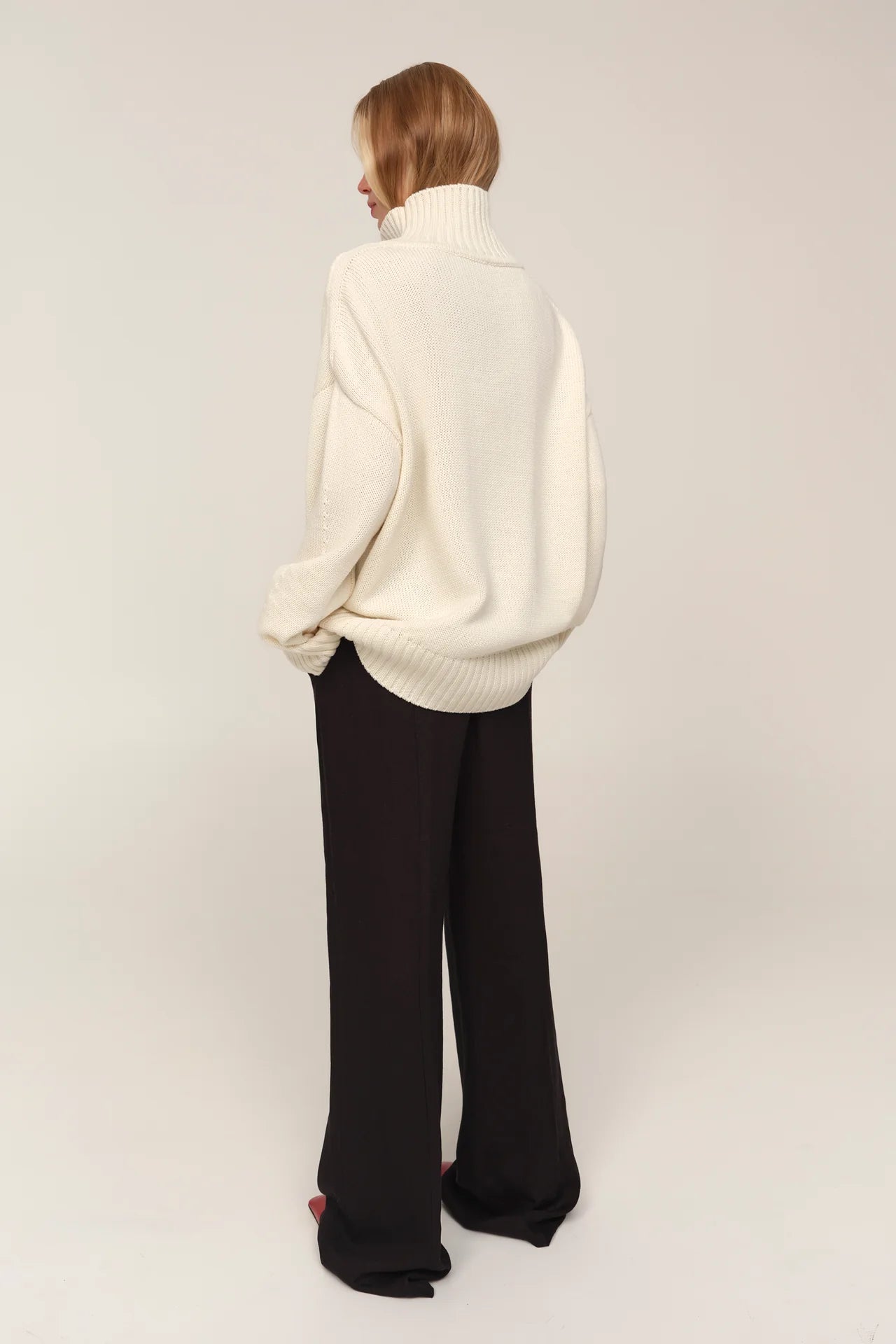 Цей светр із високою горловиною створений як сучасна класика, що поєднує комфорт і виразність форми. Його силует має відчутний об’єм, а різниця довжини між передом і спинкою додає конструктивної особливості та легкості. Подовжені рукава створюють відчуття затишку, а м’яка фактура підкреслює невимушеність образу. Це річ, що працює як основа гардеробу: природна у щоденних поєднаннях і виразна у більш продуманих стилізаціях.