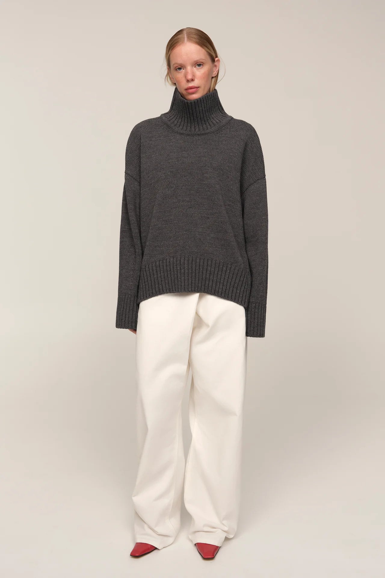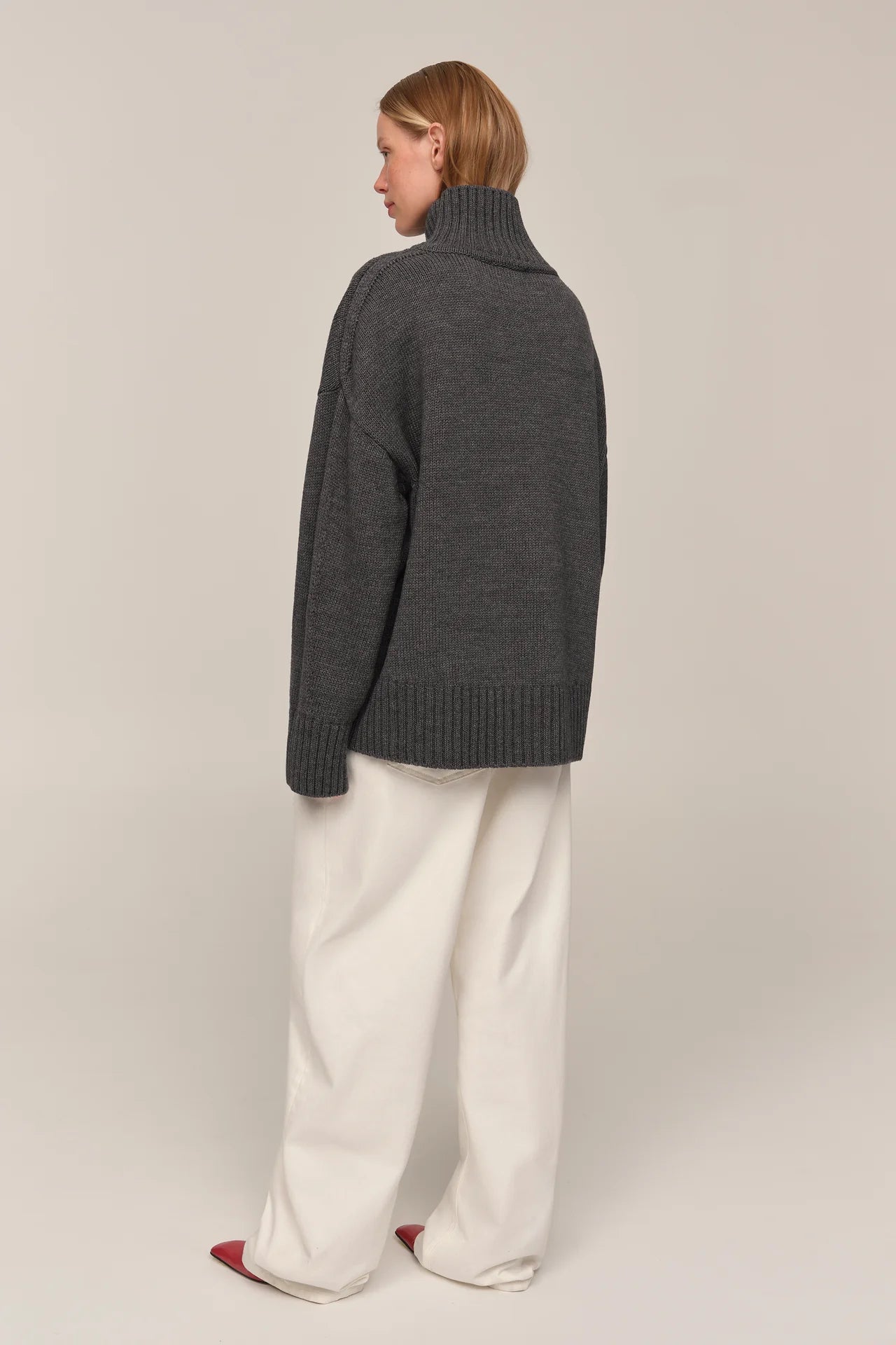 Цей светр із високою горловиною створений як сучасна класика, що поєднує комфорт і виразність форми. Його силует має відчутний об’єм, а різниця довжини між передом і спинкою додає конструктивної особливості та легкості. Подовжені рукава створюють відчуття затишку, а м’яка фактура підкреслює невимушеність образу. Це річ, що працює як основа гардеробу: природна у щоденних поєднаннях і виразна у більш продуманих стилізаціях.