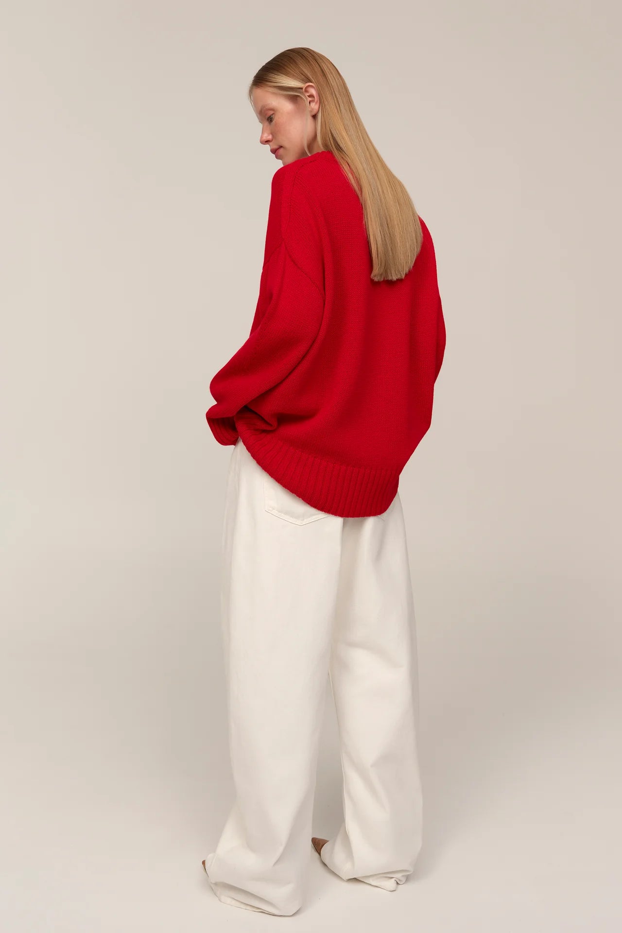 Об’ємний силует, м’яке плетіння та виразна фактура роблять його річчю, яка сама формує образ. Асиметрія між передом і спинкою надає силуету виразності та підкреслює продуманість форми. Подовжені рукава створюють відчуття затишку, а завдяки мериносовій вовні светр відчувається особливо природним, додаючи тепла без зайвої ваги.