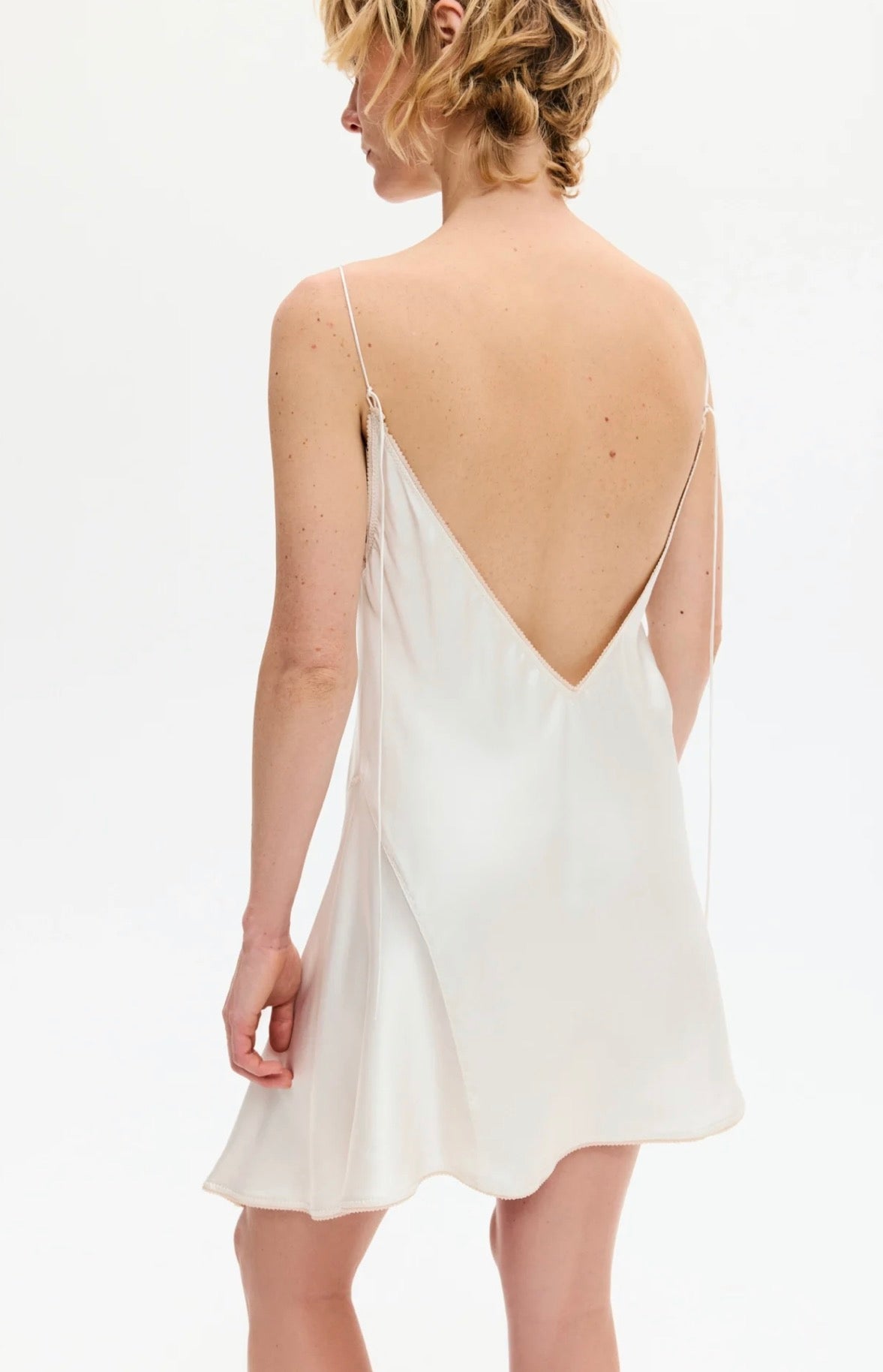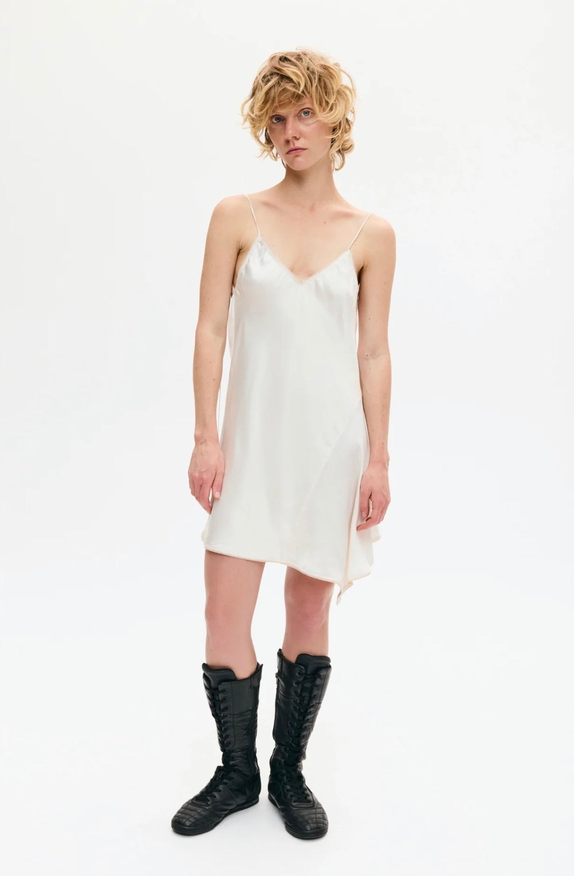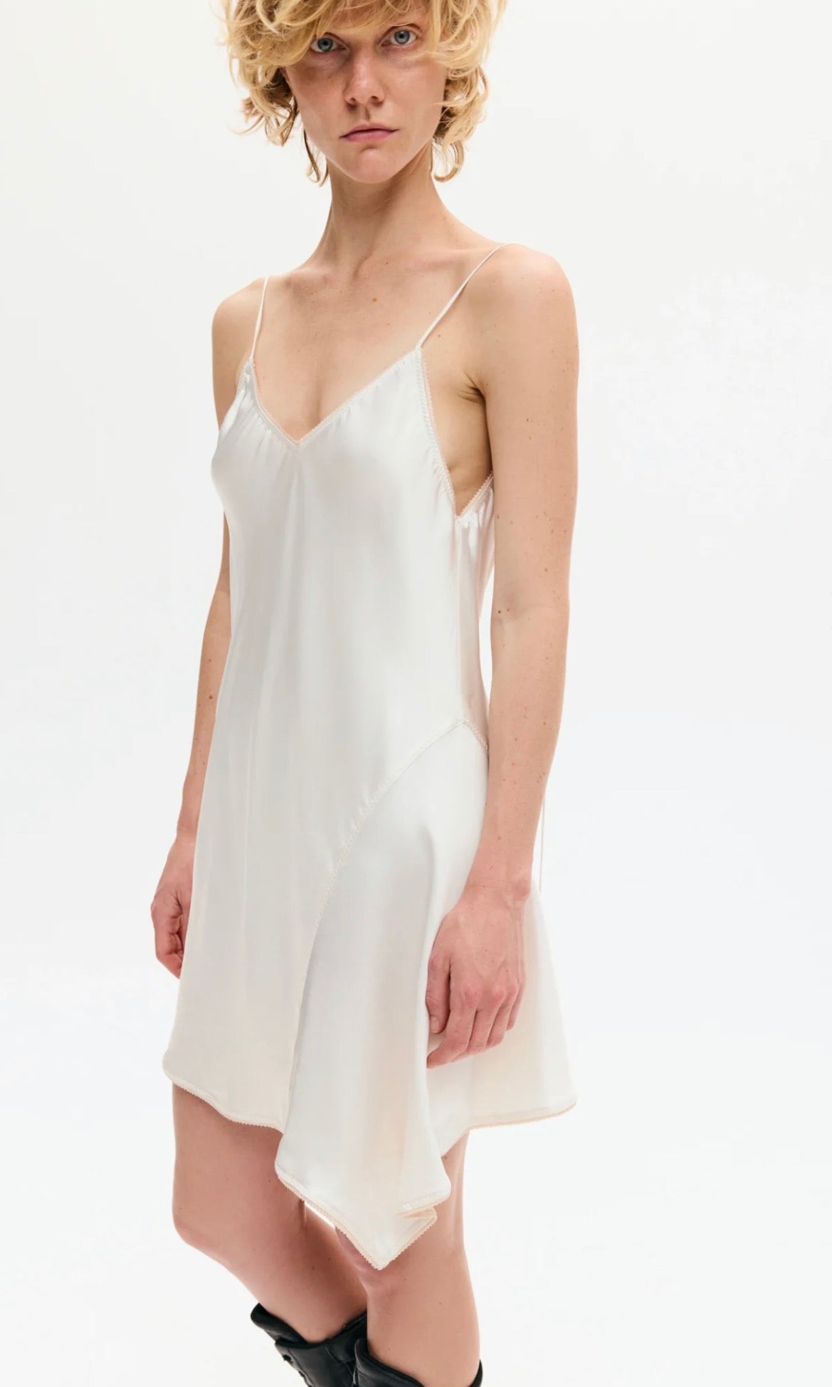 Сукня напівприлегла, скроєна по косій. Всі зрізи оздоблені резинкою з фестонами. Бретелі з атласного шнура регулюються в довжині. Без застібки.
