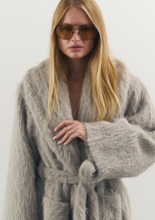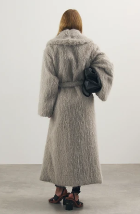 Довге пухнасте пальто з вільним силуетом. Має широкі лацкани, довгі рукави та накладні кишені спереду. Виконане з м’якої фактурної тканини, із поясом. Ідеально підходить для багатошарового образу в холодний сезон.
