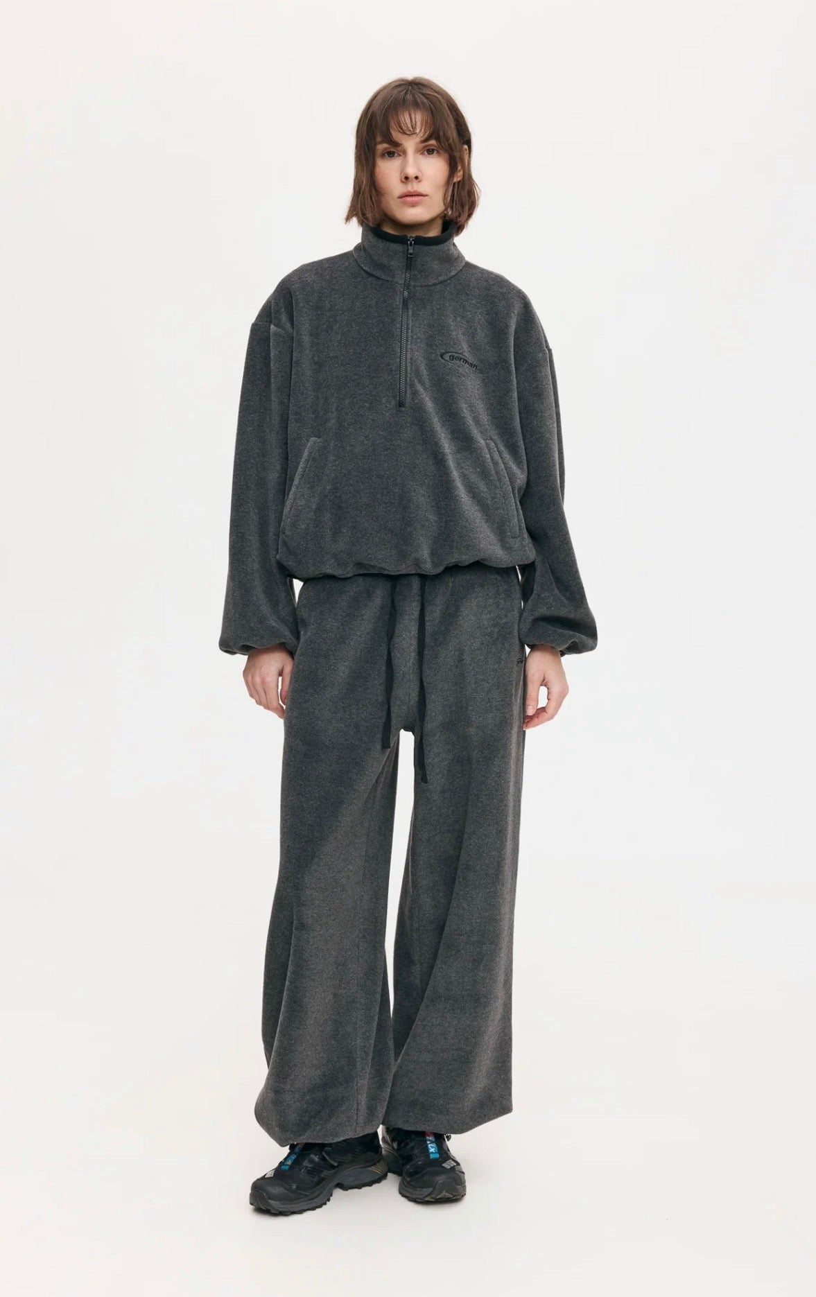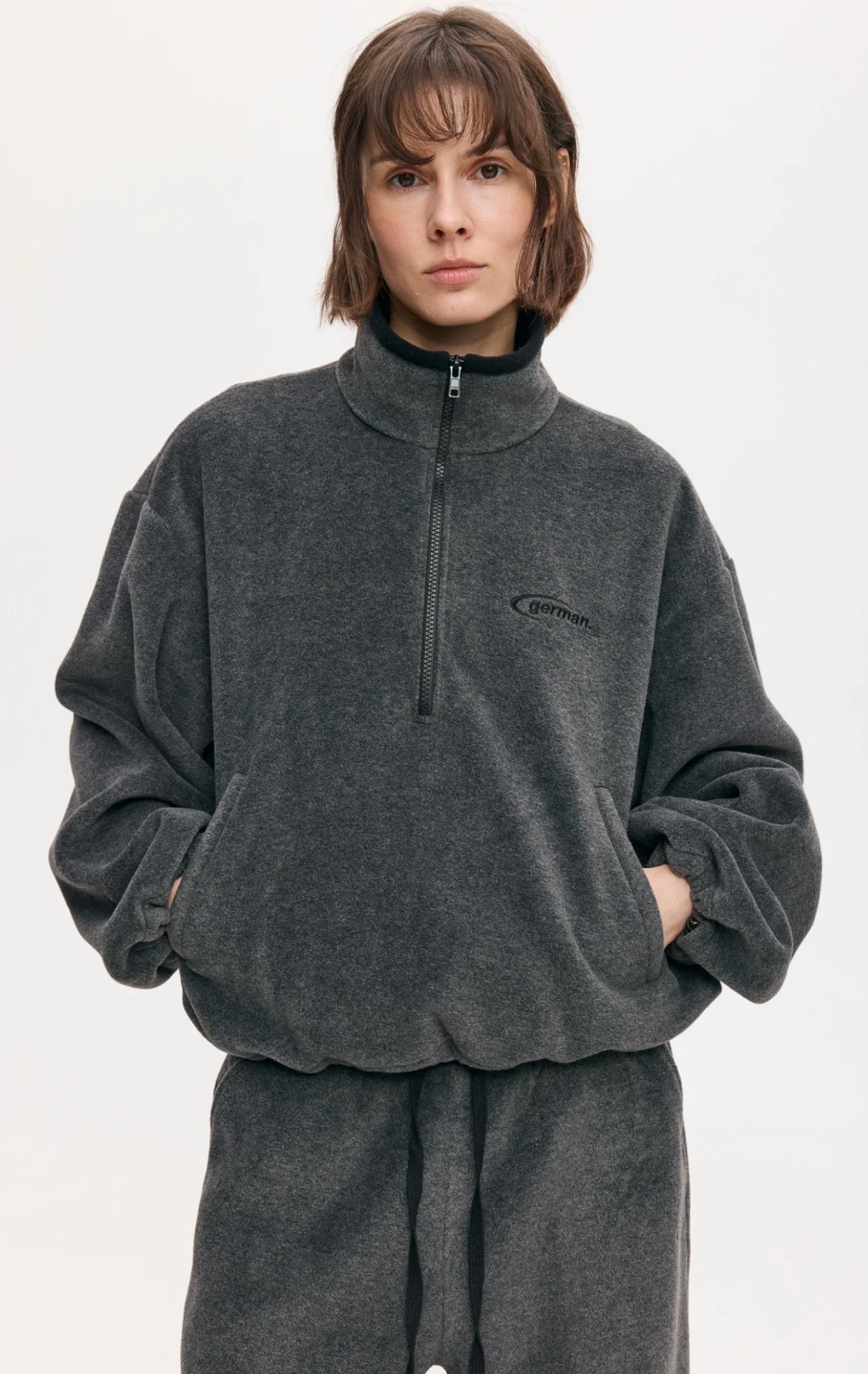 Кофта oversize силуету вкорочена. На застібці, має кишеню. Низ виробу та рукавів з резинкою зі стоперами. Спереду вишитий стилізований логотип “german.”
