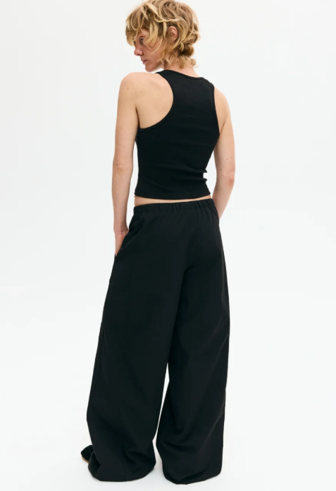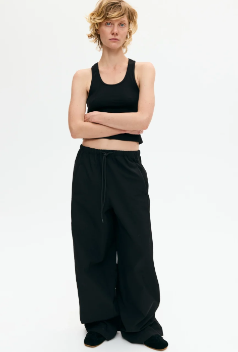 Штани вільного крою з плащівки. Пояс на резинці зі шнуром. З кишенями. Оздоблені кантом в колір тканини. Спереду принт стилізованого логотипу.