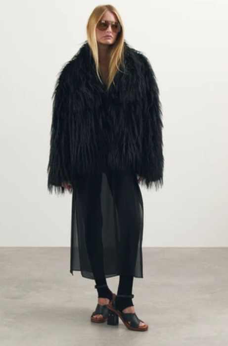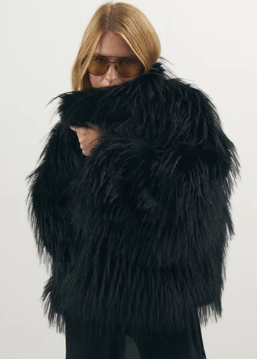 Коротке пальто з екохутра чорного кольору. Створене з високим коміром-стійкою та застібкою спереду на приховані гачки. Має лаконічний силует із сучасними пропорціями. Універсальна модель, що додає образу структури та фактурності в зимовий сезон.